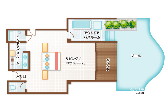 スイートルームと同じ造りのお部屋で、1階に位置しお部屋のテラスからそのままラグーンプールへ直接入る事が出来る |