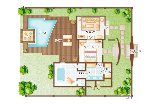 | 部屋タイプ | 敷地面積 | 景観 | 専用プール | 間取り | 備考 |